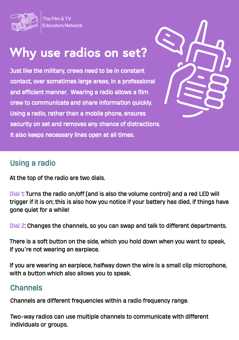This week, we have resources to explain why radios are used on set and an introduction to how to use them.